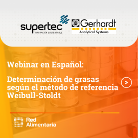 Webinar En Español: Determinación de Grasas Según el Método de Referencia Weibull-StoldtFecho del Evento: 09/11/2021 11:00hs Supertec representante oficial de Gerhardt Analytical Systems en Argentina tiene el agrado de invitarlos a participar del WEBINAR EN ESPAÑOL: DETERMINACIÓN DE GRASAS SEGÚN EL MÉTODO DE REFERENCIA WEIBULL-STOLDT Alimentos · Piensos · Hidrólisis · Extracción9 de Noviembre de 2021 11:00 a 13:00 (Hora Argentina) Seminario web dirigido a responsables y técnicos de laboratorioPROGRAMA1. Introducción - Definición de grasas. - Estructura y sistemática de los ácidos grasos. - Importancia económica de la grasa. - Métodos de determinación de grasas.2. Preparación de muestras con contenido de grasas - Homogeneidad. - Preparación de muestras. - Peso inicial. - El secado.3. Digestión en ácido clorhídrico (Hidrólisis) - Principio e implementación. - Hidrólisis clásica y automatizada. - Dilución. - Filtración y lavado neutral. - Secar el residuo del filtro.4. Extracción - Trabajo seguro con disolventes orgánicos. - Extracción clásica. - Extracción automatizada. - Principio e implementación. - Procesamiento posterior de los extractos.5. Garantía de calidad - Valores en blanco y estándares. - Posibles errores en el análisis de grasas. Puede ver el programa completo y registrarse en forma gratuita en el siguiente link: https://lnkd.in/gbGfm_xSupertec Fundada en 1998 ofrece soluciones al mercado de la instrumentación analítica para laboratorio y proceso, brindando alta calidad de servicios y soluciones. Trabajando con compañías líderes internacionales, Supertec es referencia en el mercado que opera en Argentina y América Latina.Más información: +54 11 4307-2141www.supertec.com.ar info@supertec.com.ar, gabriela.lupo@supertec.com.arPiedras 1930, C1140ABP, Buenos Aires, ArgentinaEn publicaciones anteriores el horario difundido tenía un error de tipeo. El horario correcto del Webinar es de 11:00 a 13:00 hs (Hora Argentina)Compartir en FacebookCompartir en TwitterCompartír en Linkedin Eventos - Calendario
