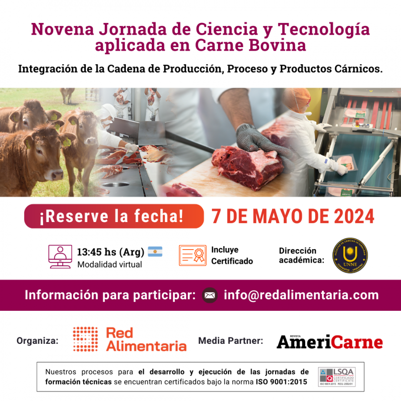 La Novena edici&oacute;n de la Jornada de Ciencia y Tecnolog&iacute;a Aplicada en Carne Bovina &ldquo;Integraci&oacute;n de la Cadena de Producci&oacute;n, Procesos y Productos C&aacute;rnicos&rdquo;, organizada por Red Alimentaria, se realizar&aacute; el pr&oacute;ximo 7 de mayo de manera virtual a partir de las 14 horas (Argentina). Con el objetivo de abarcar las distintas necesidades de toda la cadena productiva, el programa acad&eacute;mico, coordinado por la Dra. Gladis Rebak -Prof. Titular de la C&aacute;tedra Tecnolog&iacute;a de los Alimentos FCV de la Universidad Nacional del Nordeste (UNNE)-, estar&aacute; orientado a las principales tem&aacute;ticas que preocupan al sector c&aacute;rnico para lograr la calidad de sus productos. As&iacute;, quienes asistan a la transmisi&oacute;n de la 9na. Jornada de Ciencia y Tecnolog&iacute;a Aplicada en Carne Bovina, podr&aacute;n actualizarse sobre: &ldquo;Uso de Glicerol sobre la producci&oacute;n de carne en el NEA&rdquo; - Disertante: M.V. C&eacute;sar Kucseva, Magister, Dr. en Ciencias Veterinarias INTA - EEA Colonia Ben&iacute;tez. &nbsp; &ldquo;La otra cada de la Ganader&iacute;a&rdquo; - Agust&iacute;n Russi, de certificadora LSQA.&nbsp;&nbsp;&nbsp;&nbsp;&nbsp;&nbsp;&nbsp; &nbsp;&nbsp; &ldquo;Trazabilidad con est&aacute;ndares GS1&rdquo; - Roxana Saravia, Gerente de Innovaci&oacute;n y Desarrollo en GS1 Argentina. Al finalizar las disertaciones, se realizar&aacute; una Mesa Virtual coordinada por la Dra. Gladis Rebak, en la que los disertantes responder&aacute;n las preguntas de los asistentes. La participaci&oacute;n en la Novena Jornada de Ciencia y Tecnolog&iacute;a Aplicada en Carne Bovina es sin costo. Para participar se requiere inscripci&oacute;n previa a trav&eacute;s de este link https://forms.gle/qBtprebebNQZKbEP9 que dar&aacute; acceso a la transmisi&oacute;n en vivo por el canal de YouTube de Red Alimentaria. M&aacute;s informaci&oacute;n: Info@redalimentaria.com / (+54911) 40763131 <p style="text-align: center;">